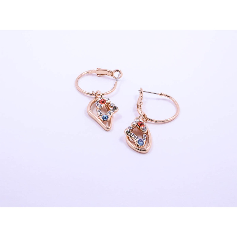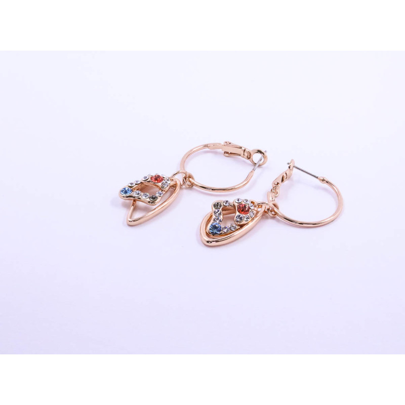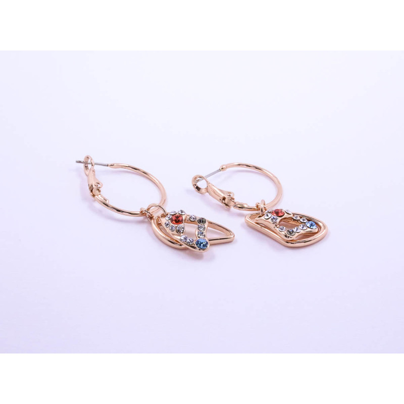 Drop earrings feature light blue and red gems inside a bigger loop of gold-plated alloy.